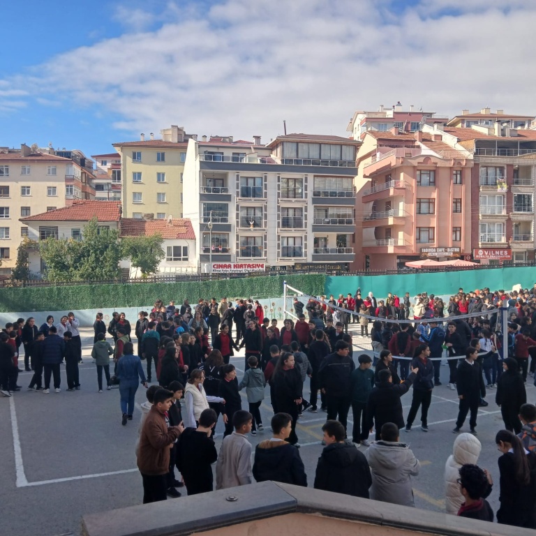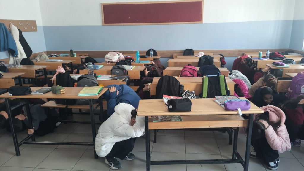 Okulumuzun tüm alanlarında çalan acil durum zil sesi ile “Çök, Kapan, Tutun” hareketi yapılarak zil sesinin bitmesi beklendi. Zil sesinin bitmesinin ardından yapılan duyuruyla öğrencilerimiz, öğretmenlerinin yönlendirmeleriyle tek sıra halinde bulundukları alanlardaki tahliye planını izleyerek, binayı terk edip toplanma alanlarına ulaştı.